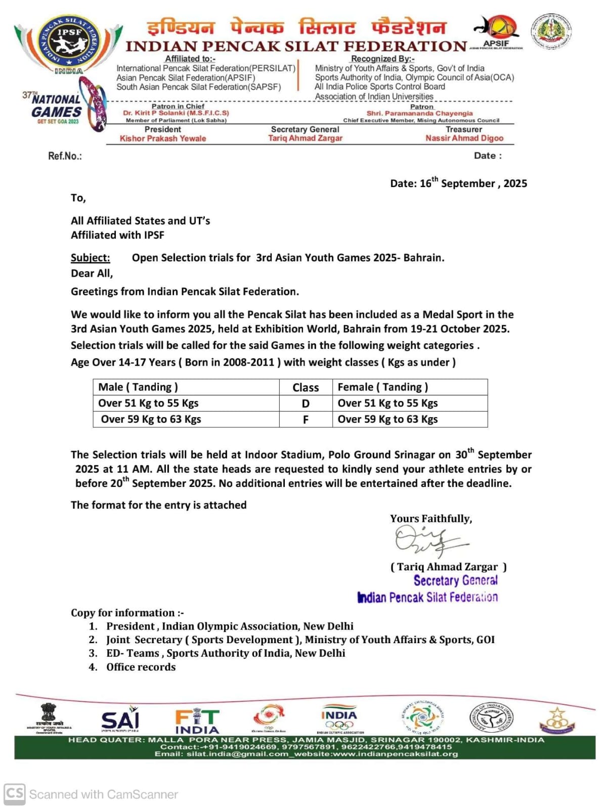 | Selection Trials – 3rd Asian Youth Games 2025 – Bhrain (Selections on 30th September 2025 at Indoor Stadium Polo Ground Srinagar) | View |